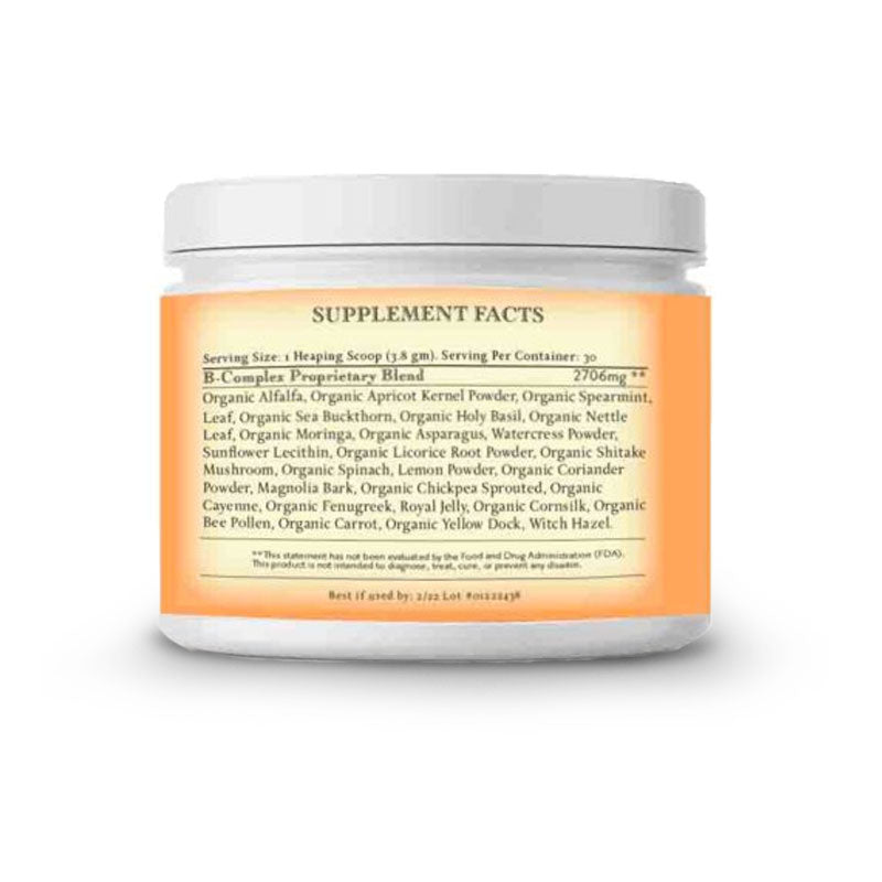 Catie's Whole Plant Food B-Complex is a complete, organic supplement derived from real, whole foods, without any synthetic or industrial ingredients. Packed with vegetables, fruits, herbs, and whole grains, it provides optimal levels of B vitamins in their natural, bioavailable form to help support your energy, stress levels, and overall well-being.