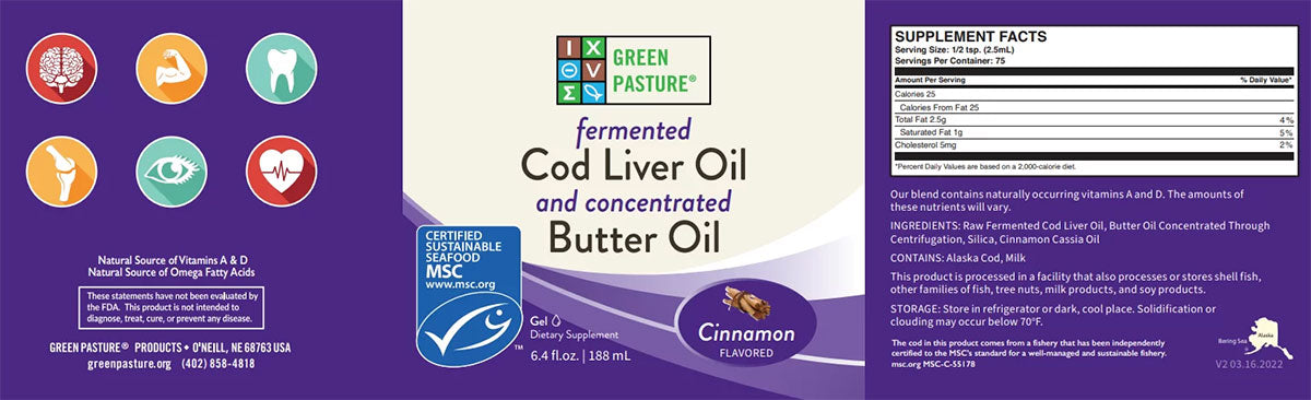 Raw Fermented Cod Liver Oil, Butter Oil Concentrated Through Centrifugation, Silica, Cinnamon Cassia Oil