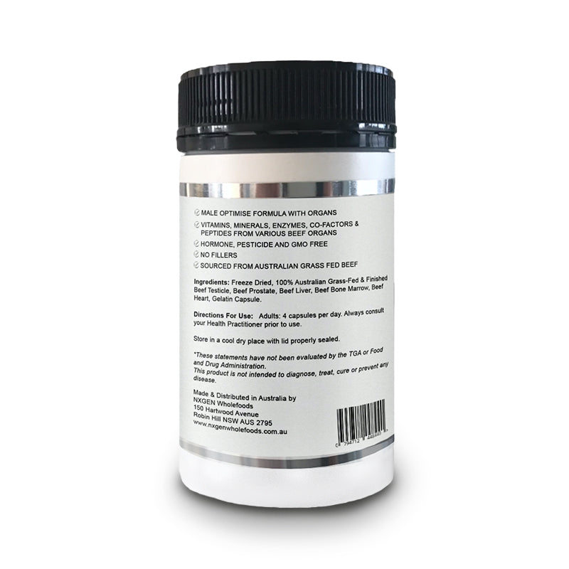 NXGEN Male Optimise is a targeted, whole-food supplement designed to support men's vitality, strength, and hormone health. It blends 100% freeze-dried grass-fed bovine organs—testes, prostate, heart, liver, andmarrow—from certified organic Australian cattle to deliver a powerful combination of peptides, enzymes, vitamins, and minerals essential for optimal male function.